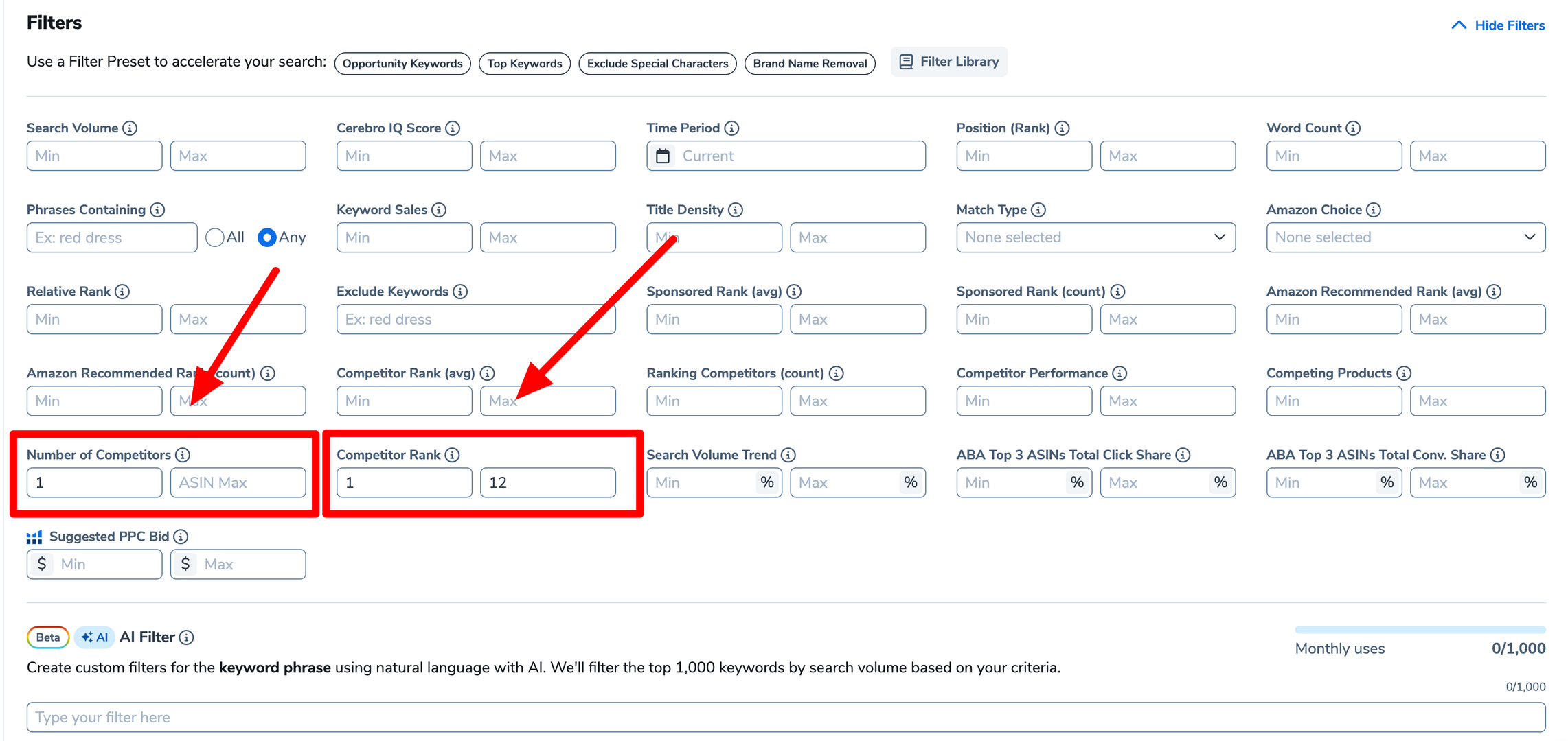 - Set your Number of Competitors to a minimum of 1 (you want at least one ASIN showing some activity on a keyword).