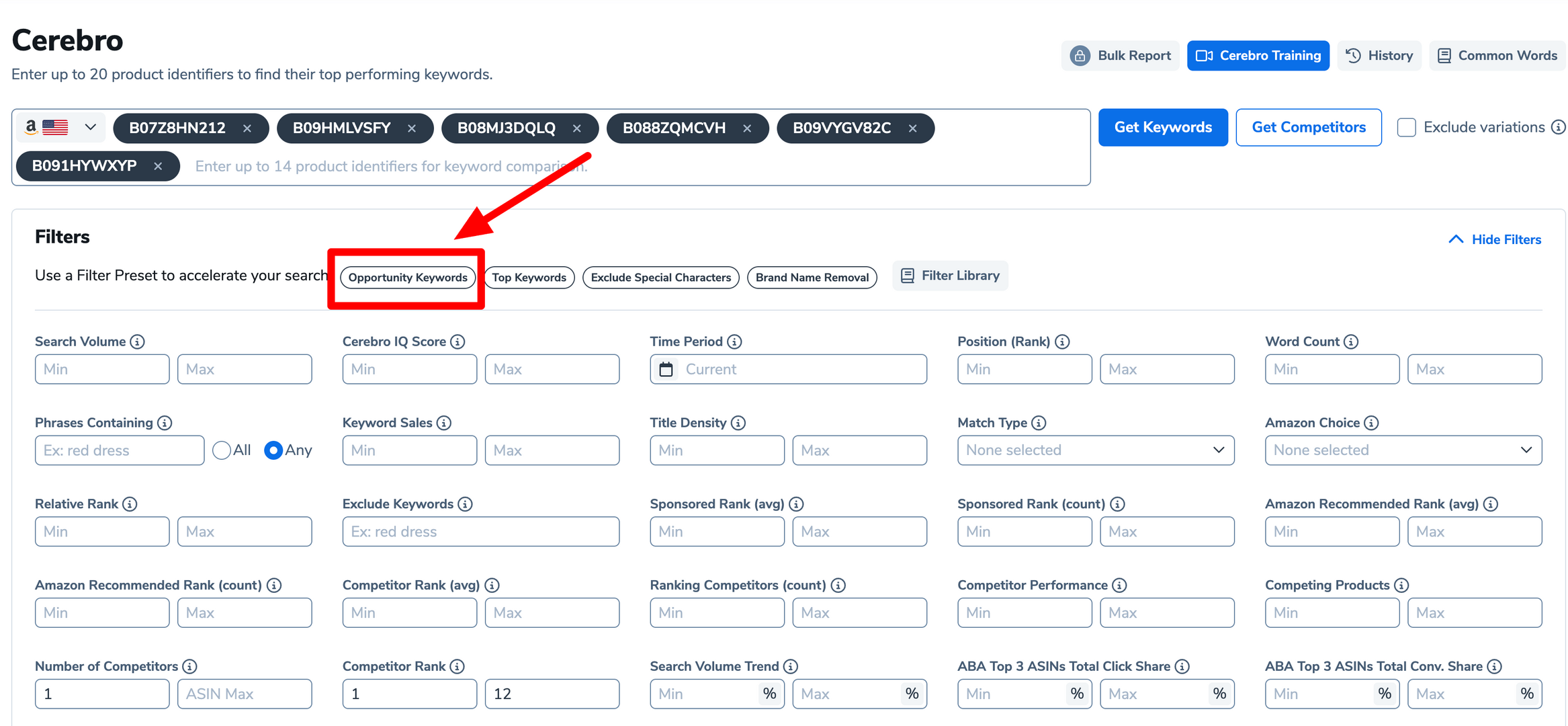 Let’s say you’ve already run a multi-ASIN search and gathered data on your competitors. Instead of focusing only on the top-performing keywords, click that little magic button called “Opportunity Keywords.”
